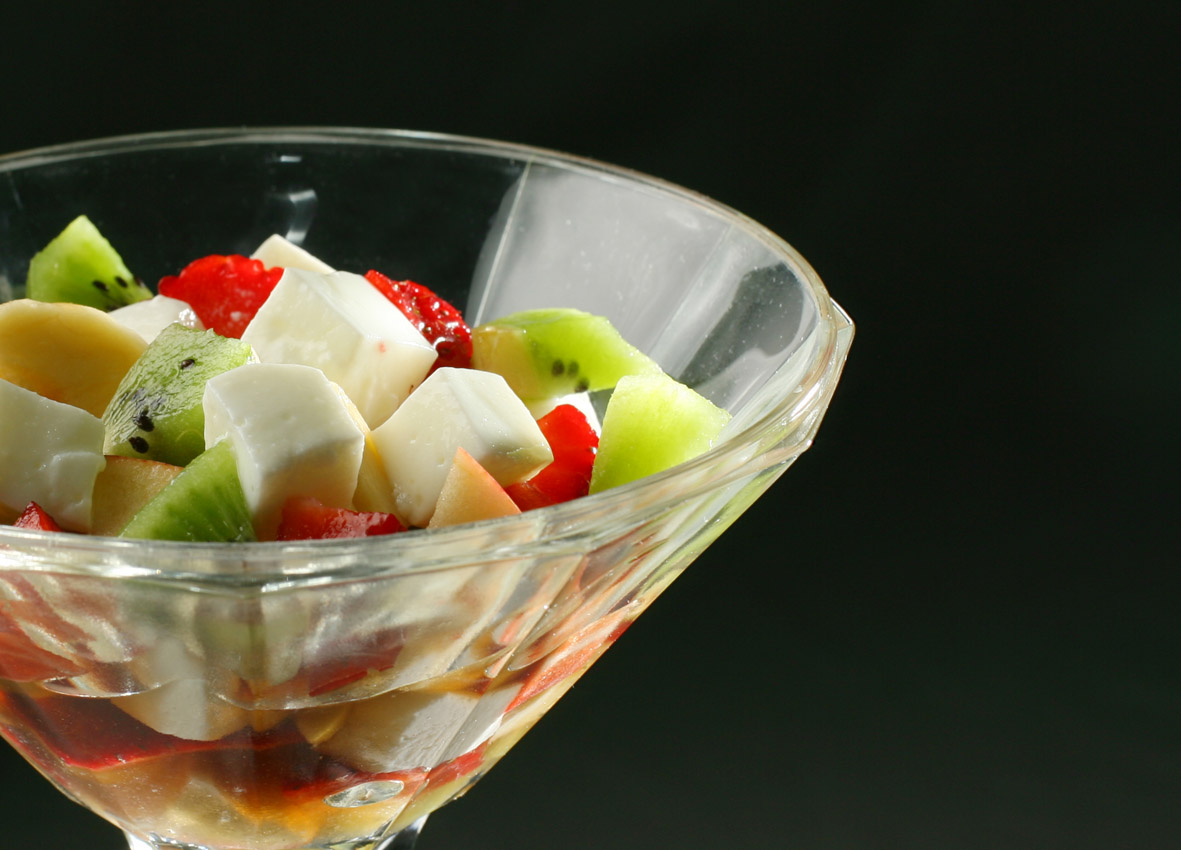 Hacer una infusión con el té, azucarar al gusto y dejar enfriar. Espolvorear Pronagar en forma de lluvia en la leche y llevar a ebullición. Cuando hierva, dejar cocer durante 2 minutos, removiendo de vez en cuando. Incorporar la leche con Pronagar a los yogures, batir y poner en un molde. Una vez fría cortar la gelatina de leche con yogur en dados. En una copa o bol de cristal colocar la fruta troceada, así como el yogur. Cubrir con la infusión de té.